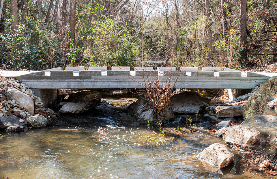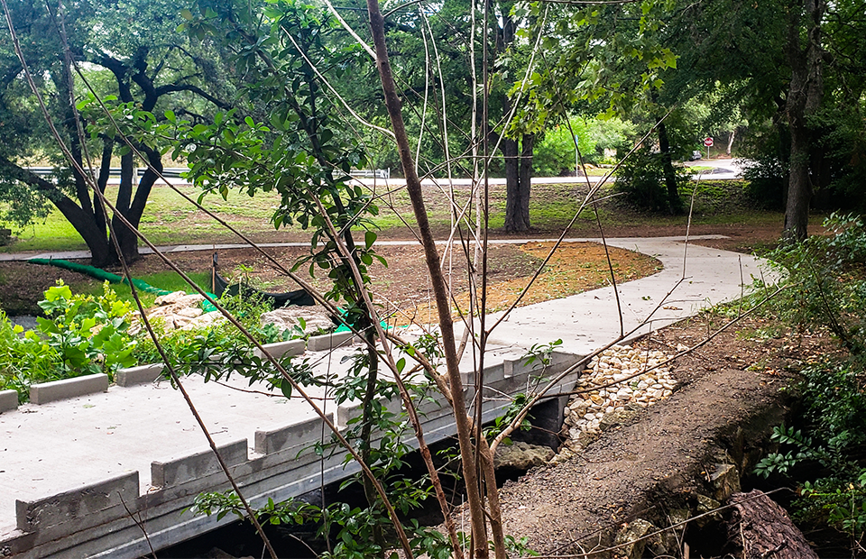 The Sculpture Garden is a popular, make-shift trail head near Lakeway City Hall. However, trail users were having to use an existing concrete encased wastewater line in order to cross Hurst Creek. The concrete encased wastewater line is very narrow and unsafe, and obviously was not meant to serve as a pedestrian crossing. Therefore, the City of Lakeway selected Huitt-Zollars to perform a preliminary engineering study and final design of an 8’ wide pedestrian bridge in addition to a new 8’ concrete sidewalk trail to replace the existing primitive trail. The pedestrian bridge is located over and within the floodplain of Hurst Creek, and therefore, there no rise in the floodplain is allowed.