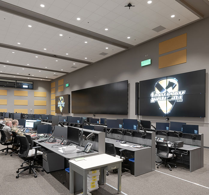 Huitt-Zollars served as the engineer of record for a design-build renovation of a 135,800-square-foot, three-story Army Division Headquarters and Command Operations Facility. The project included upgrades to the existing structure and courtyard, as well as the addition of a roof-mounted antenna platform, tactical vehicle parking, loading and service areas, and site utility improvements. The facility was organized into administrative, operational, and support spaces, and featured new mission-critical areas such as an Operations Center (OC), Network Operations Center (NOC), and a Sensitive Compartmented Information Facility (SCIF) with a Special Technical Operations (STO) Facility and an exterior Tactical SCI Vehicle Area (TSVA). Redundant HVAC systems were installed in critical areas, and the entire facility was equipped with a backup generator to ensure operational continuity during power outages.