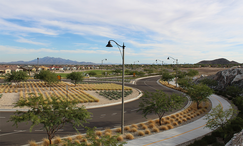 Understanding hillside grading is a key component of the northern portion of Victory. Strategically placed open space, road alignments, and the use of available boulders are examples of how Huitt-Zollars has solved challenging slopes that also provide visual interest. In addition to the residential design, Huitt-Zollars prepared the backbone infrastructure components including water, sewer, roadway, and storm drain design. Roundabouts were used to maintain traffic flow while providing traffic calming features. Roadway improvements included the signature transportation corridor, Verrado Way, as well as Indian School Road and two miles of collector streets.