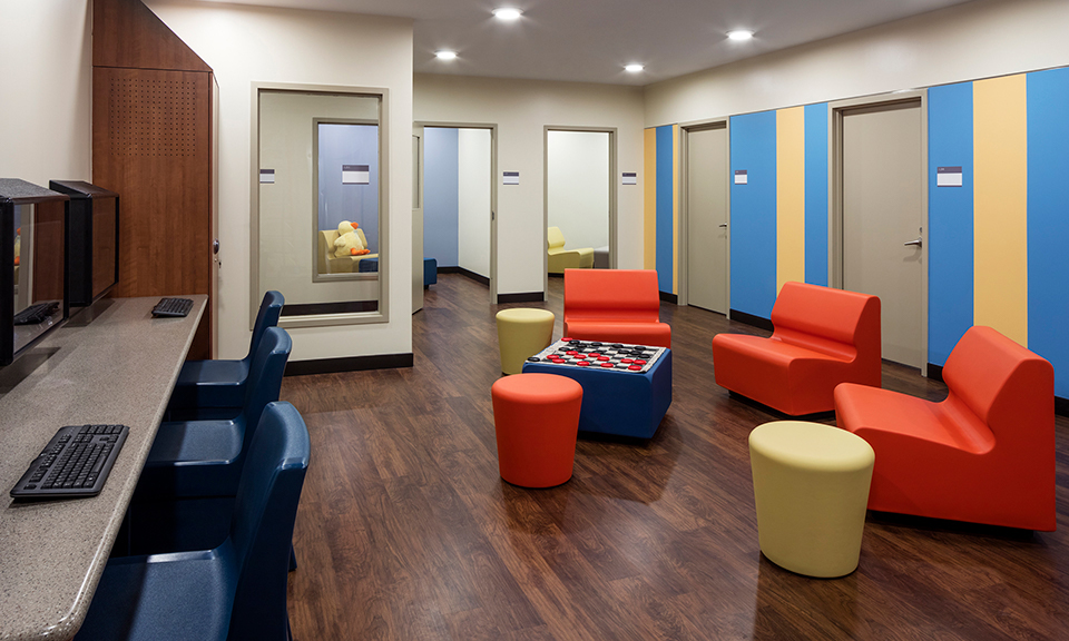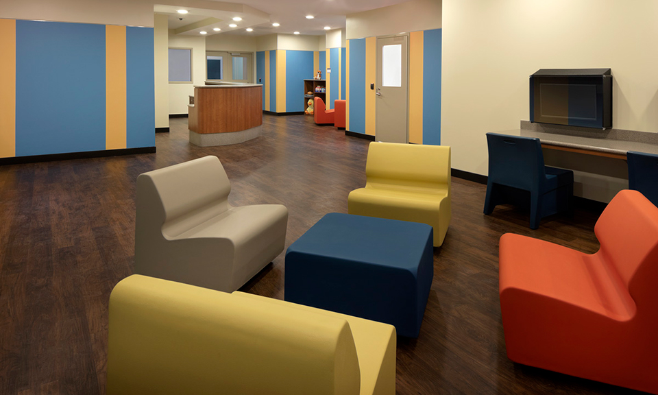 The original scope of work included only the Day Room renovation and the addition of a dedicated Pediatrics and Adolescent Seclusion Room. However, before design of the Day Room began, the Huitt-Zollars team worked with the users to understand their ultimate goals and created a master plan of the space, in order to ensure that future needs could be accommodated. The master plan was utilized in a marketing effort aimed at private donors, and was ultimately incorporated into the scope of the project. The main Reception desk was enlarged and enclosed for staff safety, and Admitting cubicles were added to increase patient privacy during initial interview. Three large Interview Rooms provide a private area for extended interviews and assessments with patients, their families, and their care team. Additional program elements include a Triage Room, a Physician’s On-Call Room, a patient Laundry Room, a patient toilet and shower, and Business Offices.