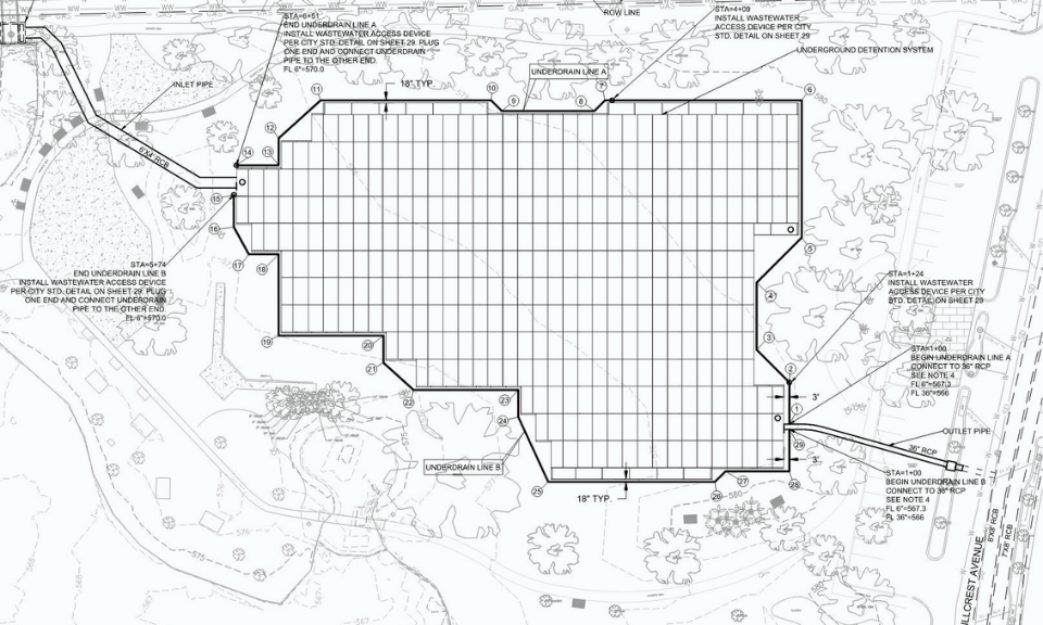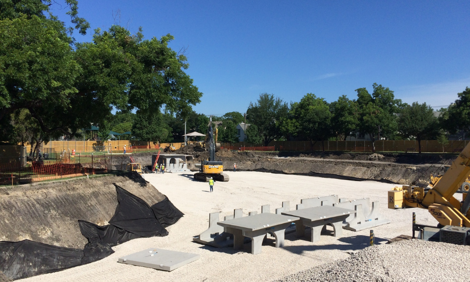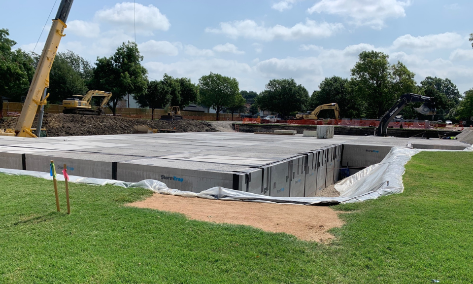 With the installation of an underground detention structure in Caruth Park, the capacity of the City’s stormwater system increased by 11 acre-feet. That equates to just over 3.5 million gallons. Once the storm drain system connecting to the underground detention system is installed, the underground detention system will help maintain Area of Interest 1 inundation extents within street rights of way during a 10-year storm event.