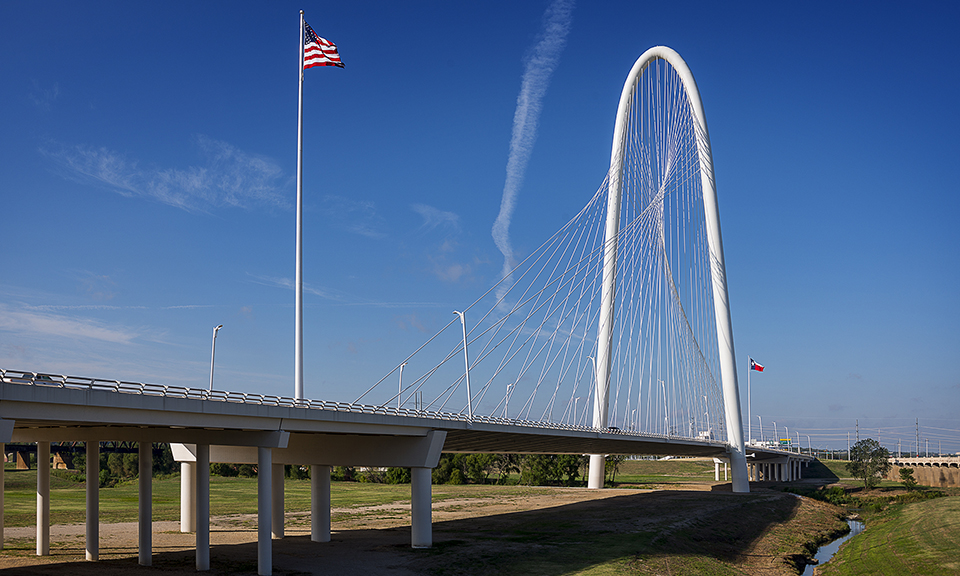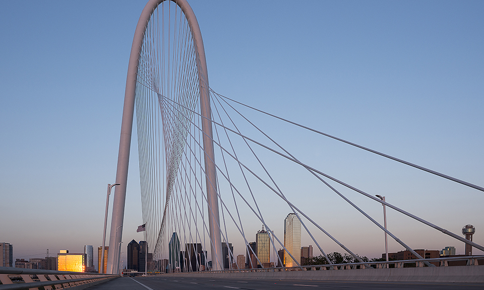 Huitt-Zollars served as the Structural Engineer-of-Record for this signature bridge adjacent to downtown Dallas. The bridge is part of the Woodall Rodgers Freeway (Spur 366) extension across the Trinity River floodplain. The 1,200-foot cable-stayed bridge has a 430-foot-tall arch pylon, supporting the six travel lane superstructure. The deck cross section consists of a central box girder, cantilevered transverse steel floor beams, longitudinal stringers and a concrete deck. Huitt-Zollars was a subconsultant to Santiago Calatrava, the prime designer.