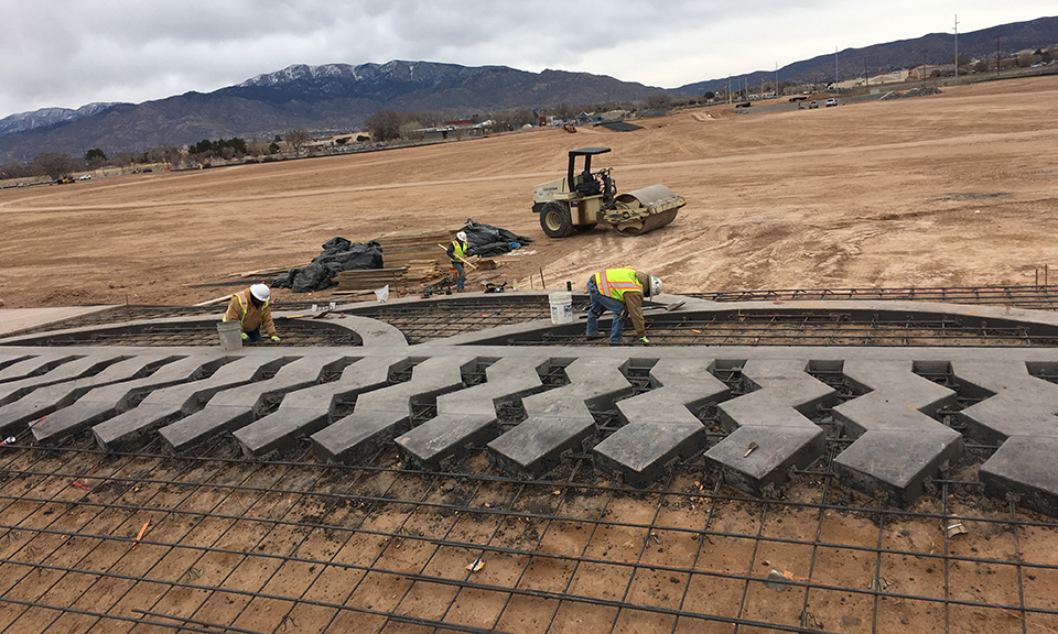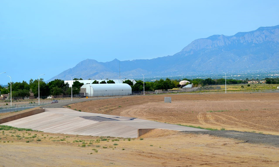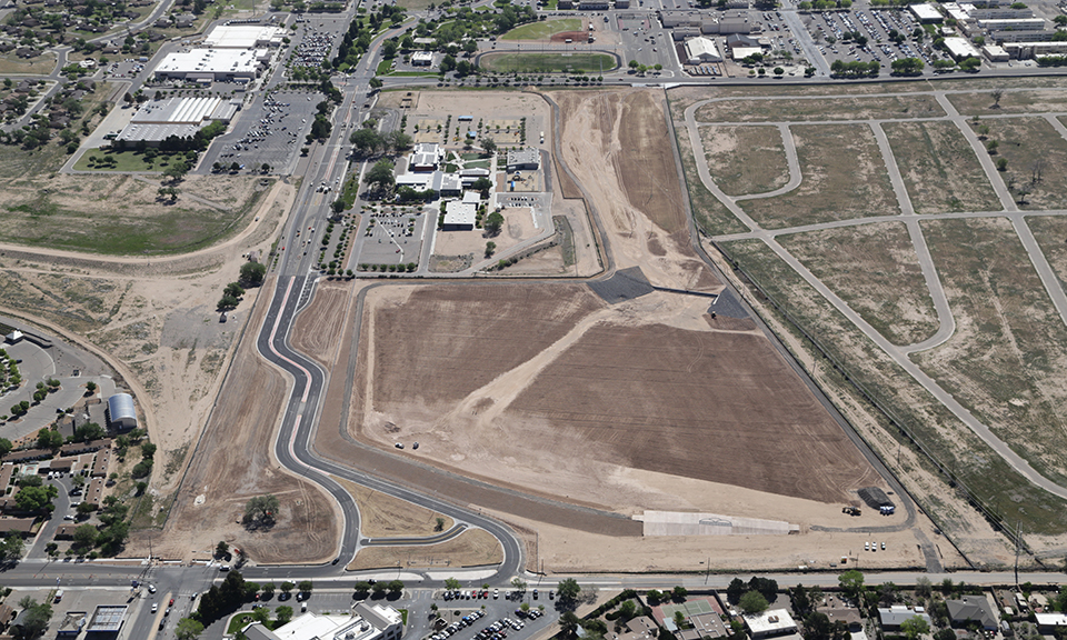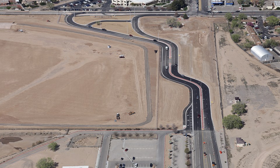 Huitt-Zollars was selected by AMAFCA to design a regional storm-drainage detention facility at the Kirtland Air Force Base (KAFB) property. During the design process of the regional stormwater detention facility, the Air Force informed AMAFCA that the Gibson access gate into KAFB was becoming a security threat to KAFB because of repetitive “gate crashers,” mainly due to the straight approach of Gibson to the security checkpoint. The Air Force requested assistance from AMAFCA to redesign the Gibson Gate entrance to KAFB. Huitt-Zollars helped the Air Force and AMAFCA in creating a team-driven design environment to expedite a roadway re-design, allowing the stormwater facility design to remain intact and the use of federal dollars to be utilized in a local agency lead contract. The entire planning through bidding process (including the additional road design) was completed by Huitt-Zollars within eight months. The City of Albuquerque coordination and review/approval was required through COA DRC, as the intersection of Louisiana and Gibson fell within City limits, while the remainder of the project fell within Kirtland Air Force Base jurisdiction and required federal approvals. Huitt-Zollars expedited design, bidding, and construction for this time-sensitive, multi-agency project which resulted in a new partnership and success story of teaming between federal and local agency design and construction.