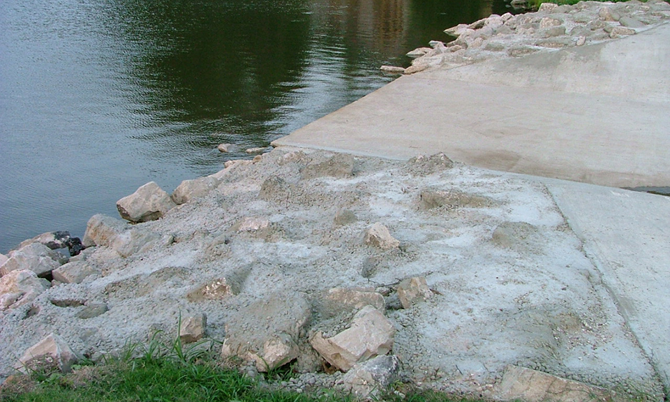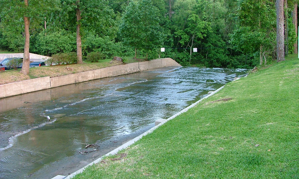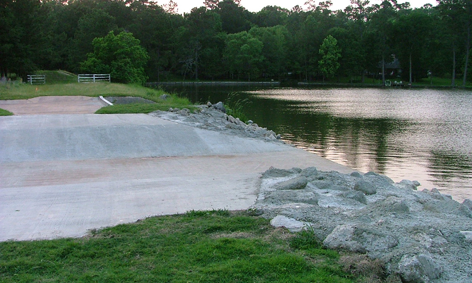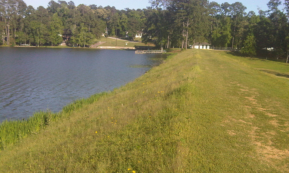 Huitt-Zollars designed improvements to the Elkins Lake Dam for the Elkins Lake Recreation Corporation. The earthen dam is more than 800 feet in length, 10 feet wide crest and 27 feet high with two spillways: an earthen service spillway and a reinforced concrete emergency spillway. The dam was enlarged to handle the Probable Maximum Flood (PMF). The scope of work included surveying, geotechnical investigations, earthwork, flowable fill, evaluation of PMF elevation, concrete channel lining repair, and submittal and coordination with the Dam Safety Division of the Texas Commission on Environmental Quality for permit approval.