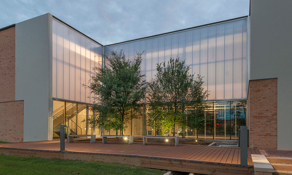 San Jacinto College is developing a curriculum where academics, innovative technology, and private industry join to fill a missing link in advanced vocational training. The new Center for Industrial Technology, sited at the front of campus along the main street, highlights the combination of academia, new technologies, and the workplace. This project embraces the technology with careful attention to the scale of the existing campus. The building has a large footprint that requires heavy service/ infrastructure and demands flexibility as future workforce needs of the community shift.