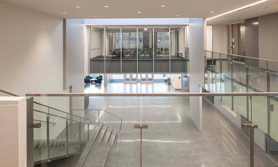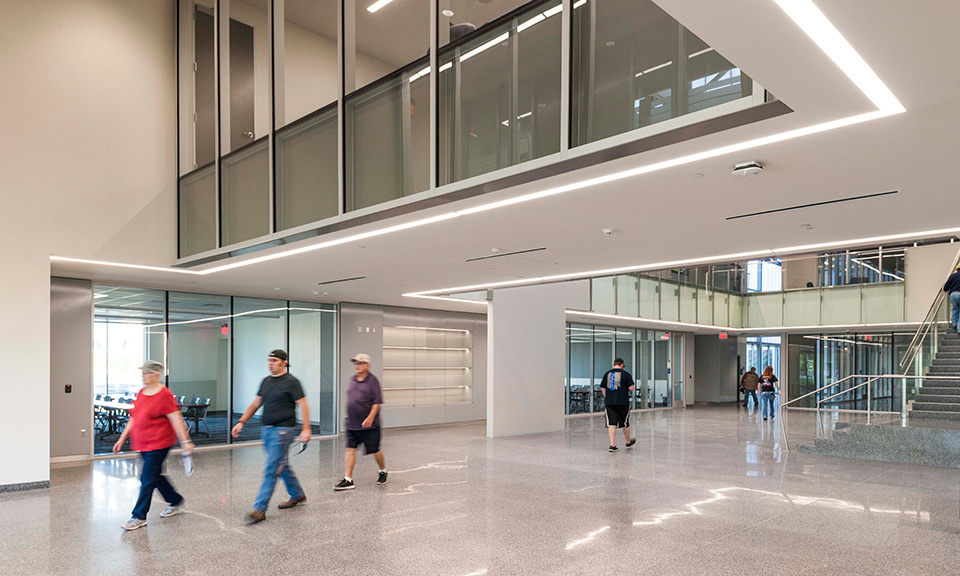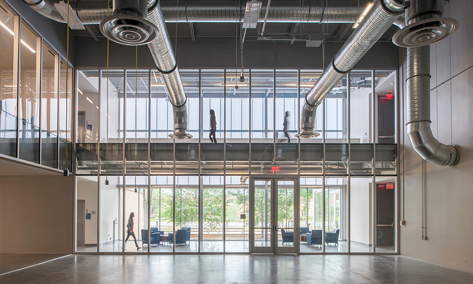 The building takes advantage of the structure naturally required for high bay laboratories to contain and express the aspirations of the community college. Namely, that the logic of what is taught and built are on display and apparent to the public as you experience the structure. Tilt wall concrete panels at the perimeter, entry and lobby mark the initial logic of the building and alternate with glazed panels for natural light into traditional classrooms and masonry clearly marked as infill. The concrete panels also hold trusses that span the large column free high bay laboratories, serving as clerestories to maximize space and natural light into the teaching labs. The structure, use, and material logic are on display from campus, lobby, and into the space between classrooms and laboratories.