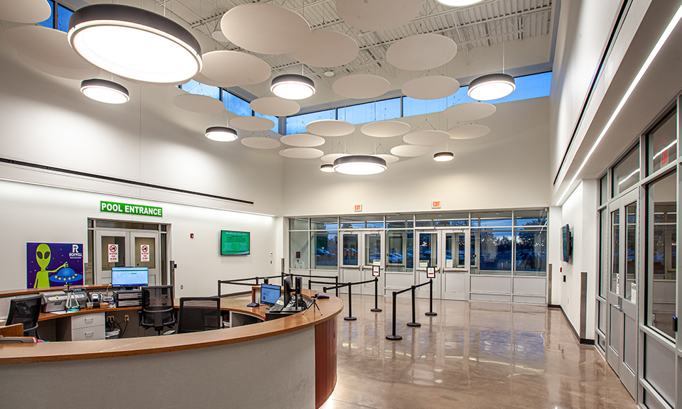 In February 2016, the City of Roswell hired Huitt-Zollars to provide design services for a new recreation center. The City of Roswell Recreation and Aquatics Center project includes an approximately 40,800-square-foot recreation center with one gymnasium area that has two full courts, four half-cross courts, and two volleyball courts with additional and telescoping bleacher seating. The two full courts and cross courts are separated by divider curtains. The recreation center also has a group fitness room and a multi-purpose room for arts and crafts, meetings, etc. The administration area has private and open office areas and support spaces. A concourse area provides the circulation to these spaces. A concession area serves both the interior and exterior of the facility. The main entry lobby is designed as a controlled area. The 11,100-square-foot aquatic center consists of an 8-lane, 25-yard lap natatorium with spectator seating. Restrooms and lockers are also part of the natatorium. The exterior aquatic area consists of an outdoor zero-entry pool and assorted play structures. Because of the planned activities for the new center, one of the major requirements was that the site needed to be at least 8-10 acres. The area includes approximately 300 parking spaces to serve the patrons of the recreation and aquatic facility.