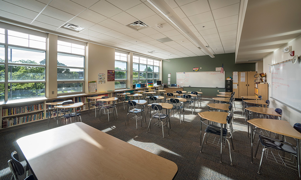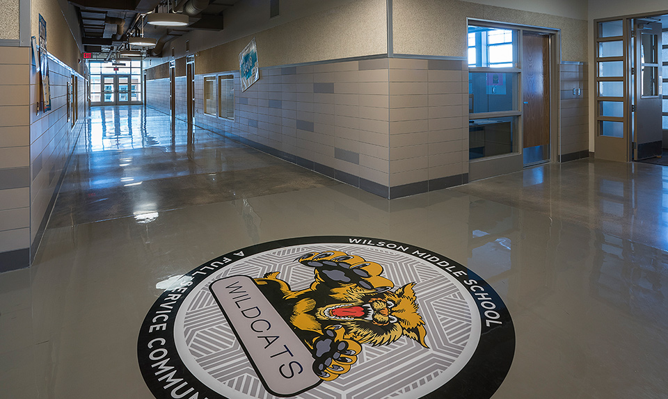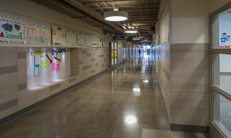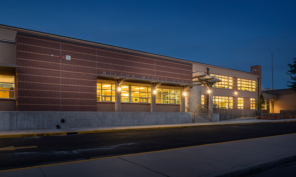The Albuquerque Public Schools retained Huitt-Zollars to expand and update the existing 60-year-old main building at Wilson Middle School. This project upgraded and expanded the classrooms, the administration suite, and the associated support spaces which include student restrooms, teacher’s lounge, custodial, and storage rooms. Existing classrooms were enlarged to meet PSFA standards for middle schools. Student restrooms were also upgraded to comply with accessibility requirements. Interior finishes are durable and easily maintained, typical for school environments. Classroom finishes are carpet, gypsum board partitions, and acoustic panels. Each classroom has natural lighting with daylight controls and occupancy sensors.