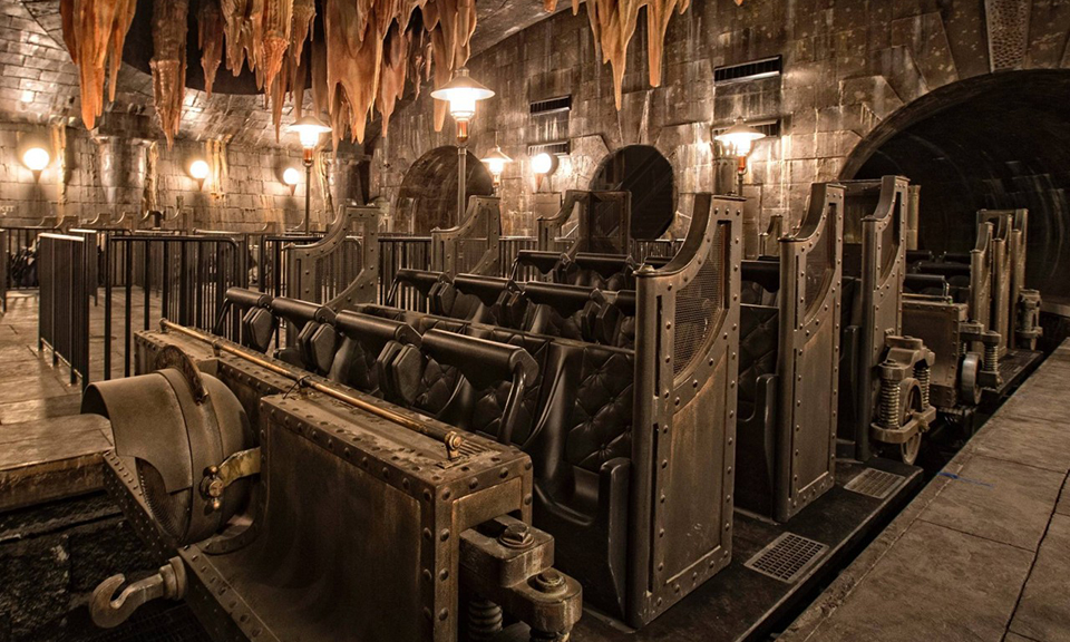 Based on the Harry Potter films, the ride includes a themed exterior, “wonked” facades, and the dramatic, full-scale recreation of “Gringotts Bank.” The attraction also includes 22,000 square feet of interior-themed guest queuing divided into eight distinctive and interactive scenes, including the grand lobby with animatronic goblins who greet guest before they embark on their underground journey. After their journey, guests can shop in the 2,500-square-foot themed and propped post-show retail shop.